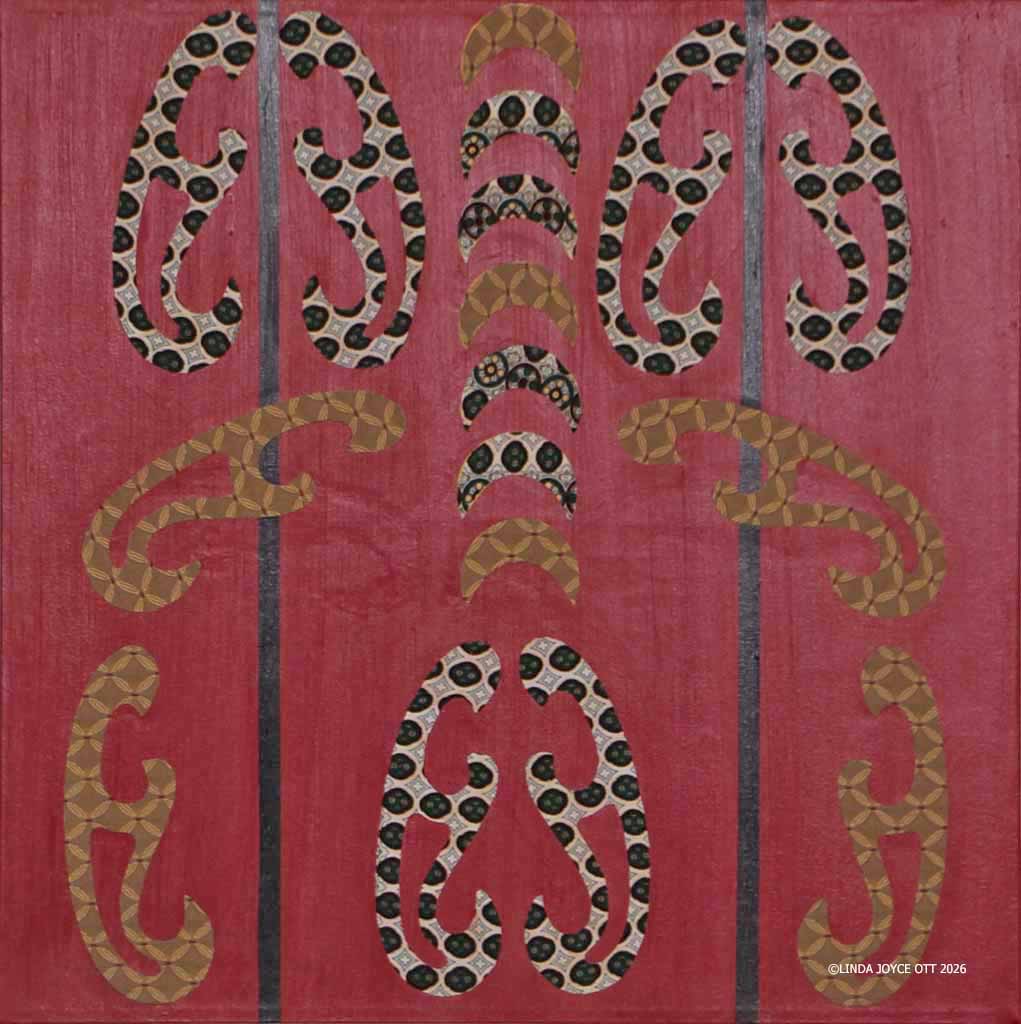 Ritual & Rhythm 1 is the first in a series of 24×24” fabric collage paintings born from that contemplative process. Each work begins with symmetry, a grounding composition of curvaceous shapes that offers balance and calm. Within that framework, I improvise with patterned textile fragments. The compositions feel both ancient and contemporary, like ceremonial objects reimagined for the present moment. Working on this piece has been deeply soothing. The repetition of selecting, cutting, and arranging becomes its own ritual, a way of settling into the present.