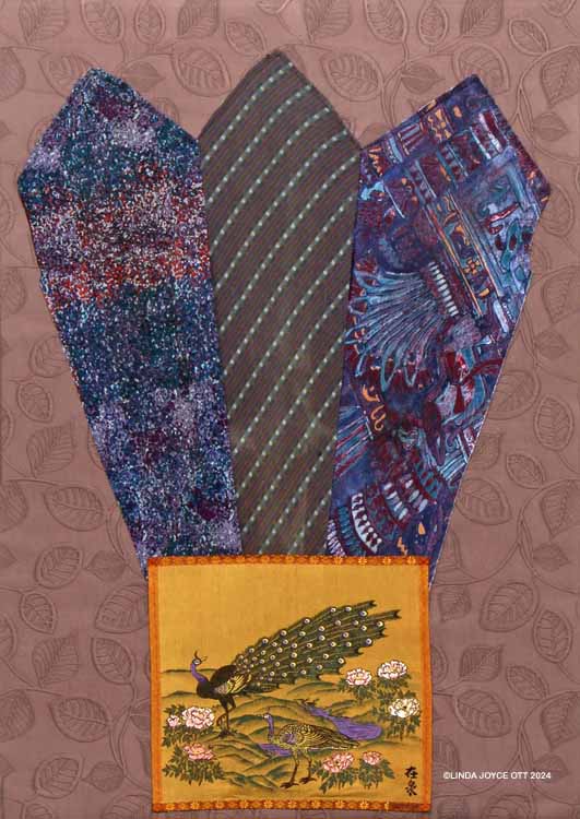 My passion for colour, fabric remnants, and vintage buttons comes together in my Textile Art series. Peacock features outmoded ties and a vintage silk calendar image on a piece of upholstery fabric. It measures 34” x 24”.